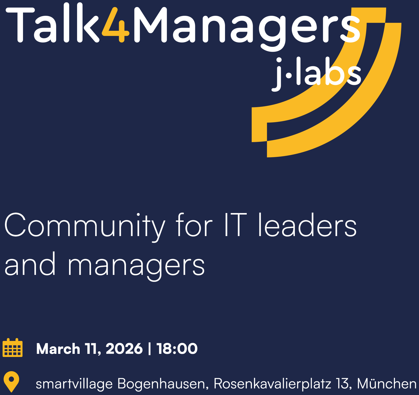 You may know us under a different name - j-tech meetup. After 5 successful editions, we decided to merge with our new initiative: Talk4Managers, which we’ve already organized 3 times in Poland and introduced in Munich last year. As the name suggests, we’re shifting towards more business- and management-focused topics while still keeping the tech background in mind.